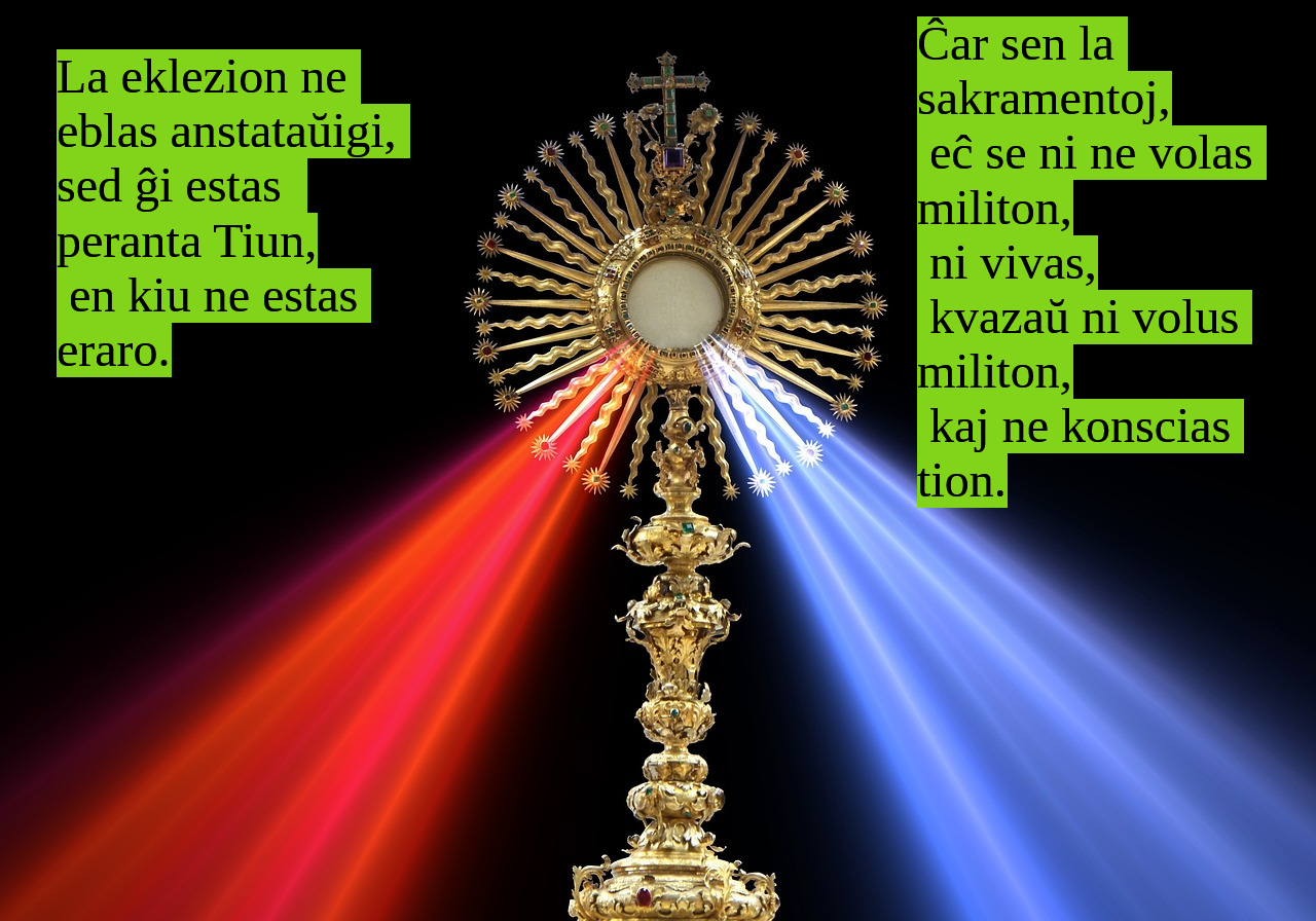 La Eklezio ankoraŭ donas enhavon, deziron vivi /Peras kaj proklamas Kriston la Savanton /